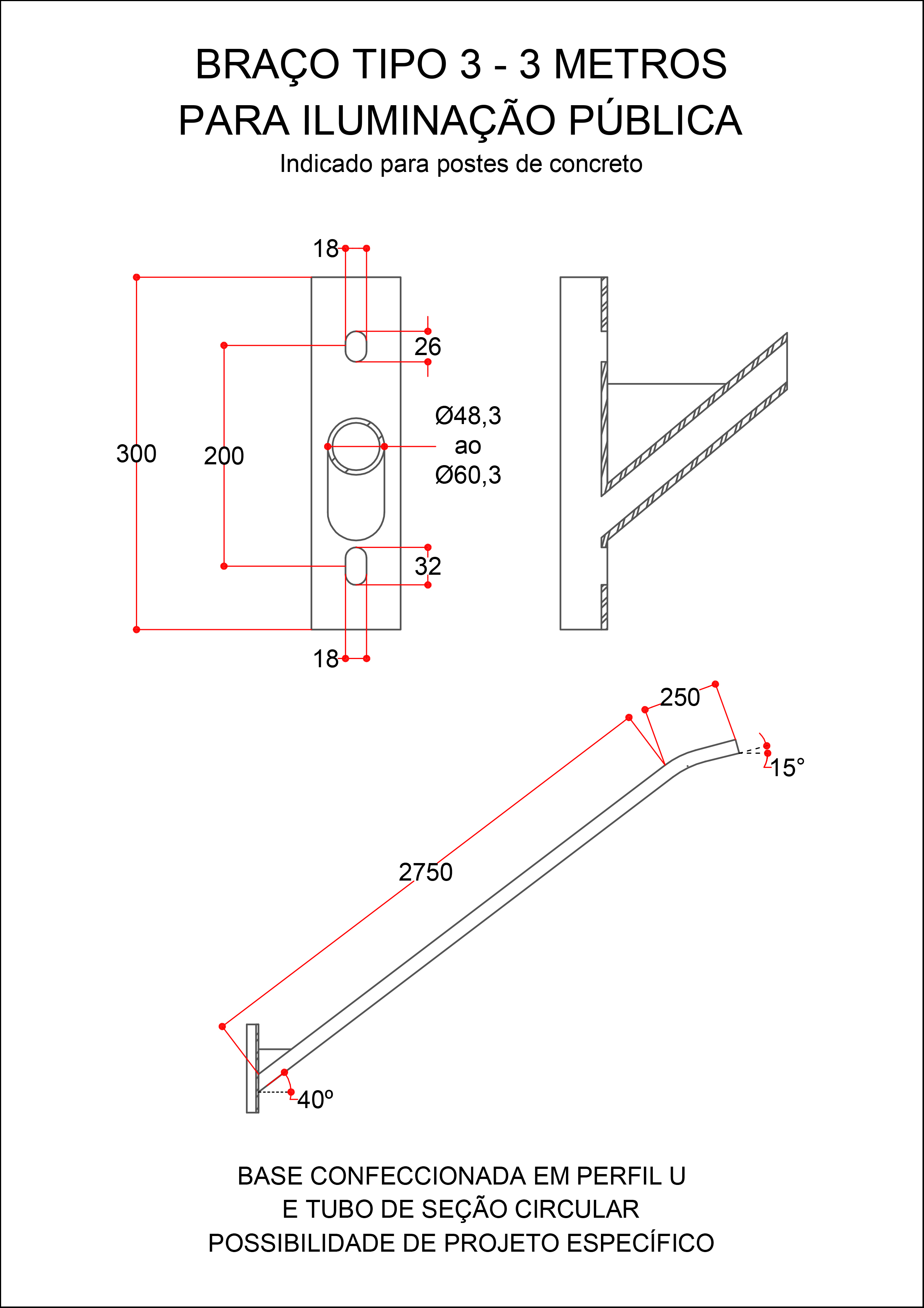 BRAÇO TIPO 3 - 3 METROS PARA ILUMINAÇÃO PÚBLICAIndicado para postes de concreto Fale Conosco Fale Conosco ProdutosSUPORTES TIPO PÉTALA POSTE TELECÔNICO RETO – PARA LUMINÁRIAS PÚBLICAS POSTE TELECÔNICO RETO MODELO MARIPOSA POSTE TELECÔNICO RETO – PARA CRUZETAS POSTE TELECÔNICO CURVO SIMPLES POSTE TELECÔNICO CURVO DUPLO MASTRO TELECÔNICO RETO – PARA BANDEIRAS BRAÇO TIPO 4 BRAÇO TIPO 3 BRAÇO TIPO 2 BRAÇO TIPO 1